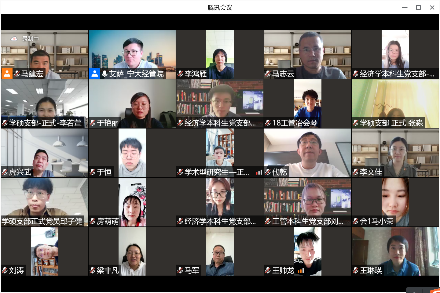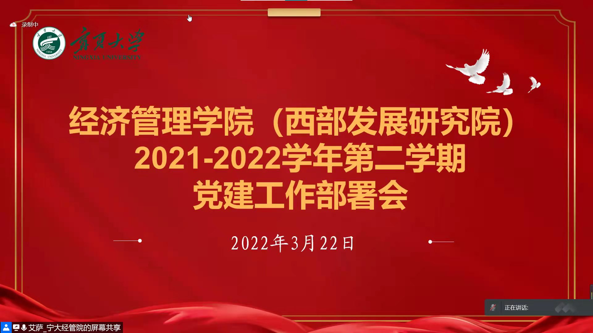 (西部发展研究院)2021-2022学年第二学期党建工作部署会在线上举行。院党委书记李胜刚、西部发展研究院副院长马军、院党委副书记马建宏、院党委委员仇娟东、学生工作办公室艾萨·阿尤普、姚硕、各党支部书记、全体教职工党员、学生党员参加本次会议。本次会议由艾萨·阿尤普主持。
