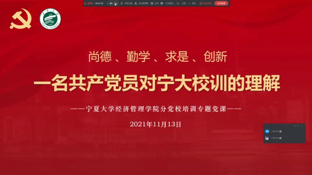 校训、校训背后的价值观及内涵,同时将校训跟党的知识相结合,表示:一名共产党员也需要做到“尚德”“勤学”“求是”“创新”。
