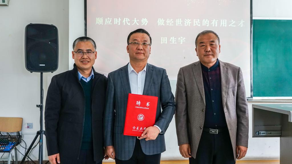 特聘田生宇为授课客座教授,朱伟、杨国涛为田生宇颁发聘书并合影留念。