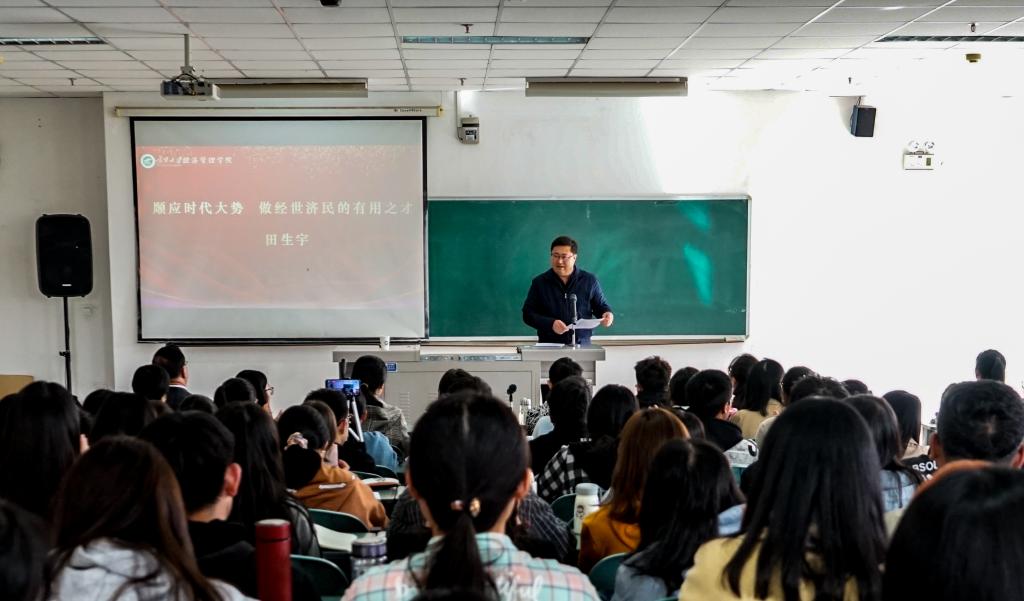 顺应大势做栋梁,脚踏实地力成才。田生宇鼓励大家坚定理想信念,认清形势,脚踏实地的深入到经济社会生活的一线当中去努力提升自己。他主题鲜明、内容生动、激人奋进的报告令同学们受益良多。会后,田生宇与在场师生于文荟楼前合影留念。青春的光辉,理想的钥匙,生命的意义,无不彰显奋斗二字。希望同学们散发理性的光辉,扛起时代的使命,做经世济民的有用之才!
