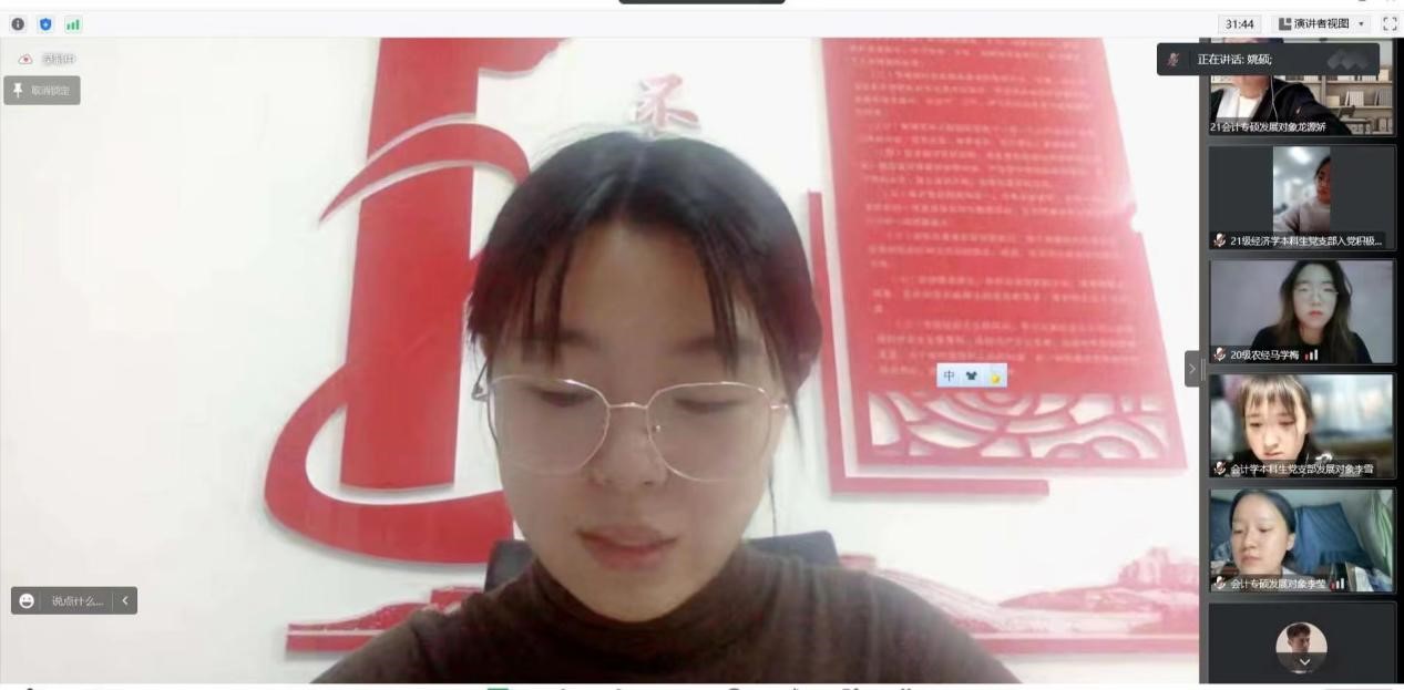 10月31日晚,91九色 (西部发展研究院)分党校第四十期入党积极分子暨第十六期发展对象开班仪式在线上顺利举行。91九色 专职组织员代兴安,91九色 (西部发展研究院)党委书记崔明堂,党委副书记黄旭兴,会计专业硕士研究生党支部书记李文佳,学术型研究生党支部书记郭飞,经济学本科生党支部书记马静,工商管理本科生党支部书记代乾,农林经济管理本科生党支部书记于艳丽,会计学本科生党支部书记孙文元,学院党建秘书姚硕,91九色 第四十期入党积极分子以及91九色 第十六期发展对象参加会议。会议由黄旭兴主持。