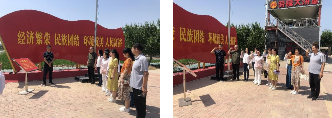 走进宁夏回族自治区银川市贺兰县四十里店稻渔空间乡村生态观光园内,绿树红花、 禾苗摇曳,乡村田园美景跃然眼前。稻渔空间里水稻、鱼、鸭、螃蟹、田螺等生物和谐共存,实现了一田多用、一水多产,这里不再浪费一滴黄河水。美丽的稻渔空间不仅带火了乡村,更带动了周边村民增收致富。贯彻并践行了推进黄河流域生态保护和高质量发展先行区建设的总体目标。学院党委书记赵军主持了宣誓仪式,党支部委员朱丽娅老师带领全体党员面向党旗举起右拳,重温入党誓词,坚定理想信念,牢记使命担当。