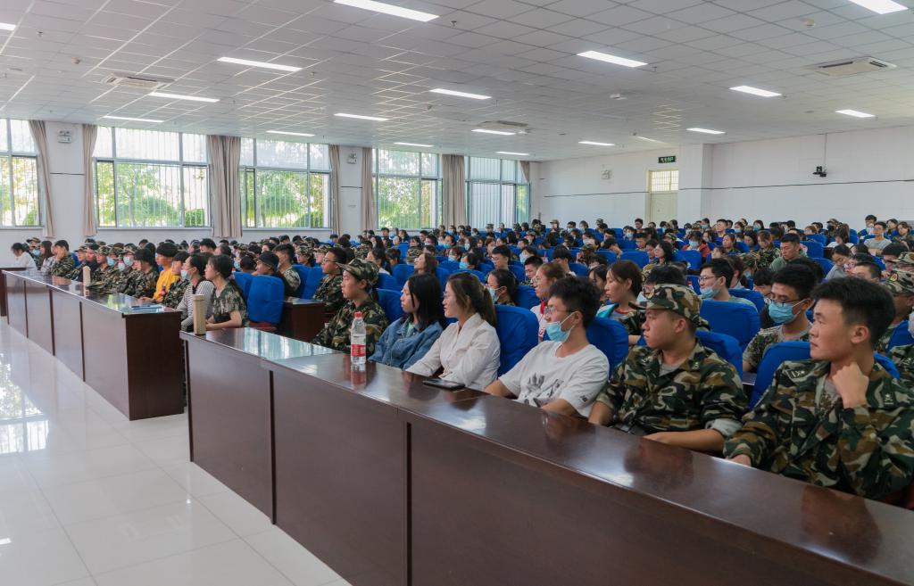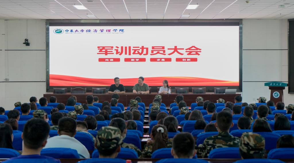 2020级本科新生军训动员大会在贺兰山校区文荟楼东报告厅顺利举行,三营七连连长程胜利,副连长何韶华、孙文元,9位班主任助理及全体参训新生到场参加。