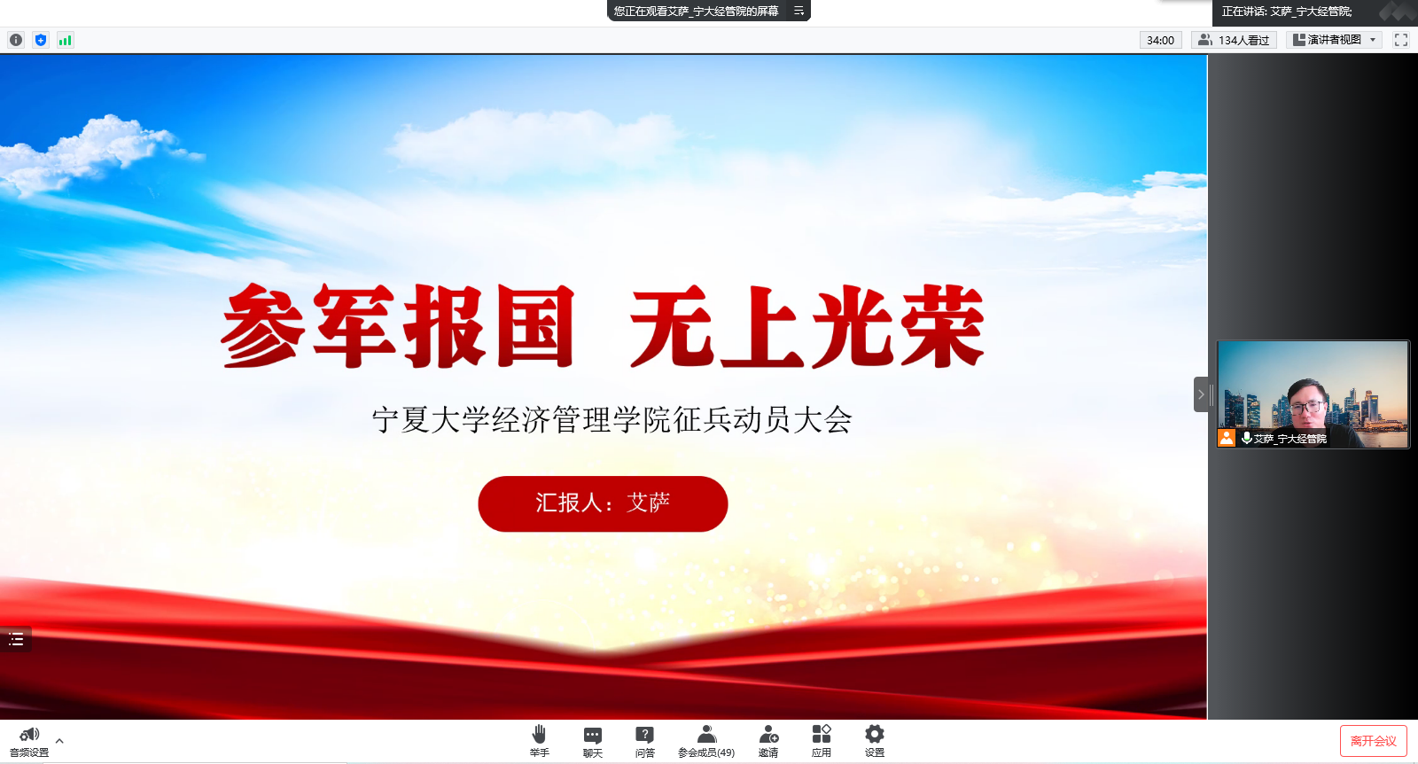 会议中,艾萨就征兵入伍的条件要求、参军入伍的意义以及具体的优惠政策三个方面帮助同学们深入了解相关政策并积极参军报国。首先,艾萨介绍了视力、体重、身高和年龄的具体标准;其次简洁明了地概括了应征入伍的优点;最后,提到优惠政策,他介绍到退役士兵不仅可以享受经济上的优惠,而且在考研升学、就业创业等方面都会得到很大的帮助。