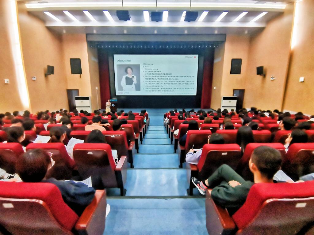 毕业生就业质量报告入手,分析了本科毕业生就业率、就业岗位的分布情况,期望同学们在本科学习期间认真学习,努力考取职业证书,提升自己的竞争力。同时她为同学们详细介绍了最适合大学生的综合性财会证书——ACCA,并鼓励同学们积极报考。