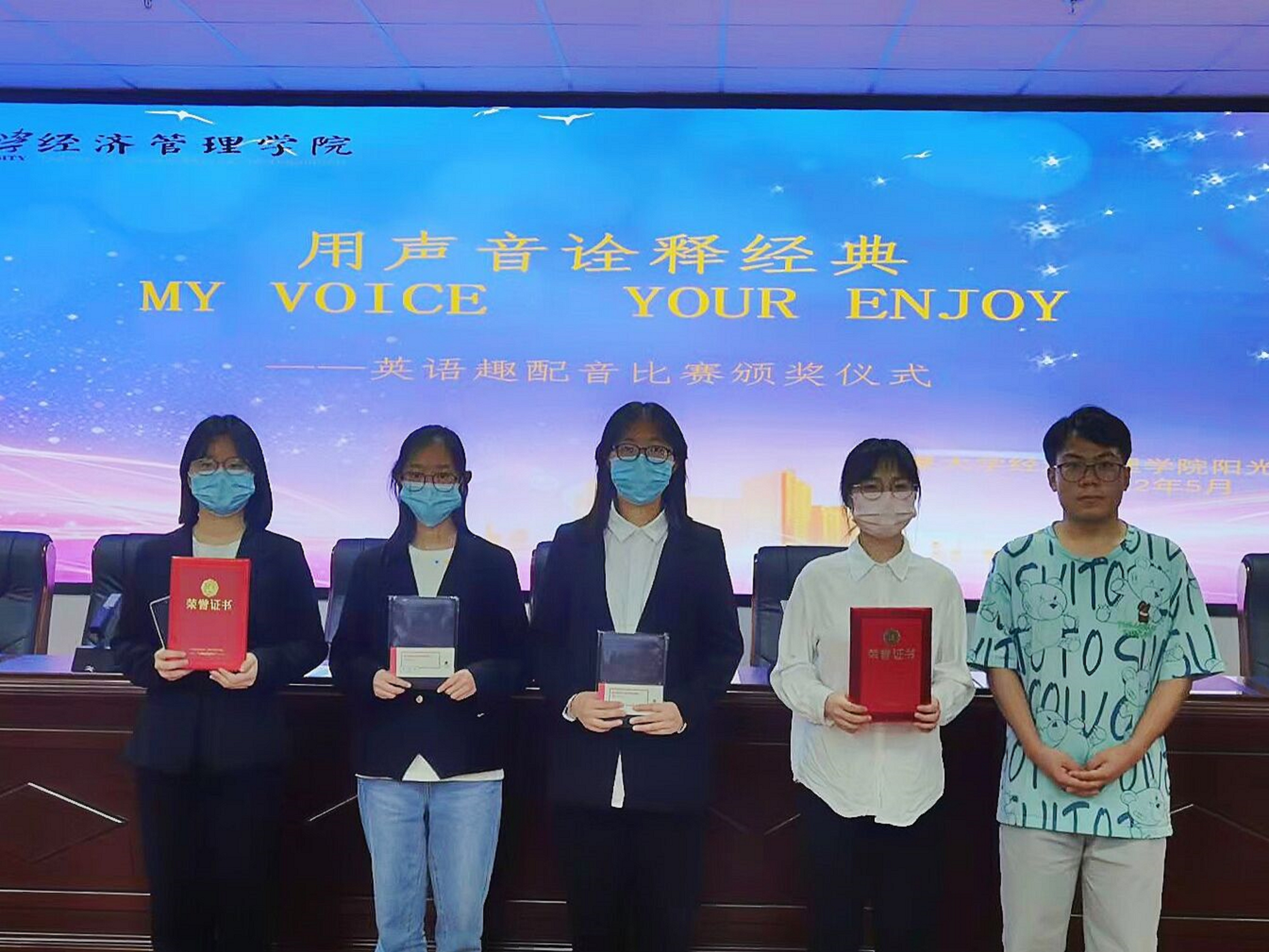 英语趣味配音比赛中,阿克丽娅·居马汗获得一等奖,赵泳杰、杨蓉蓉获得二等奖,马荣、陈海者、袁诠获得三等奖,陈欣媛、李璇瑛、张倩及法学院马彩云获得优秀奖。