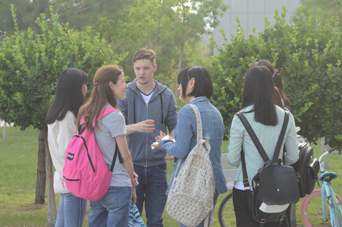 晚7点,活动成员如约而至。在主持人的提示下,外国友人与同学们自发组成5个小组,在文科楼前进行了“单词接龙”的小游戏。每个小组通过明确的分工按顺序完成相关体育项目,并在规定时间内尽可能多地传递单词。外国友人们与中国学生在相互交流与配合中,加深了默契,增进了友谊。接下来的核心环节“视频表演”中,5个小组在观看影视作品的基础上进行表演。角色分配完毕,在短时间的紧张准备后,精彩有趣的视听盛宴展现在同学们面前。《老友记》、《三傻大闹宝莱坞》等影视作品中的经典片段被组员们演出了新意,中国歌曲与外国影视的结合体现了文化的交流与碰撞。活动最后,美国友人用一段炫酷的rap把现场的气氛推向了高潮,为本学期的英语角活动画上圆满的句号。