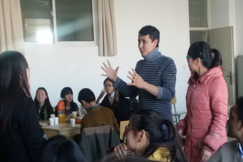 此次活动共分为“词语接龙”、““害”你在心口难开”“中国传统茶艺表演”和“古诗英译”四个环节。简单的自我介绍之后,活动正式拉开了帷幕。在前两个环节的游戏中,同学们互相了解,熟悉,并且用英语进行简单的交流,气氛非常融洽。伴随着宛转悠扬的古筝声,活动进入第三环节,同学们欣赏了经济管理学院茗韵茶艺社成员带来的中国传统茶艺表演,在场的外国友人更是纷纷惊叹不已,赞不绝口。第四环节是以小组为单位进行“古诗英译”集体游戏。拿到题目后,同学们时而凝眉深思,时而抓耳挠腮,中外文化的碰撞更是让现场妙趣横生。最后,外国友人带来的精彩节目为活动画上了圆满的句号。