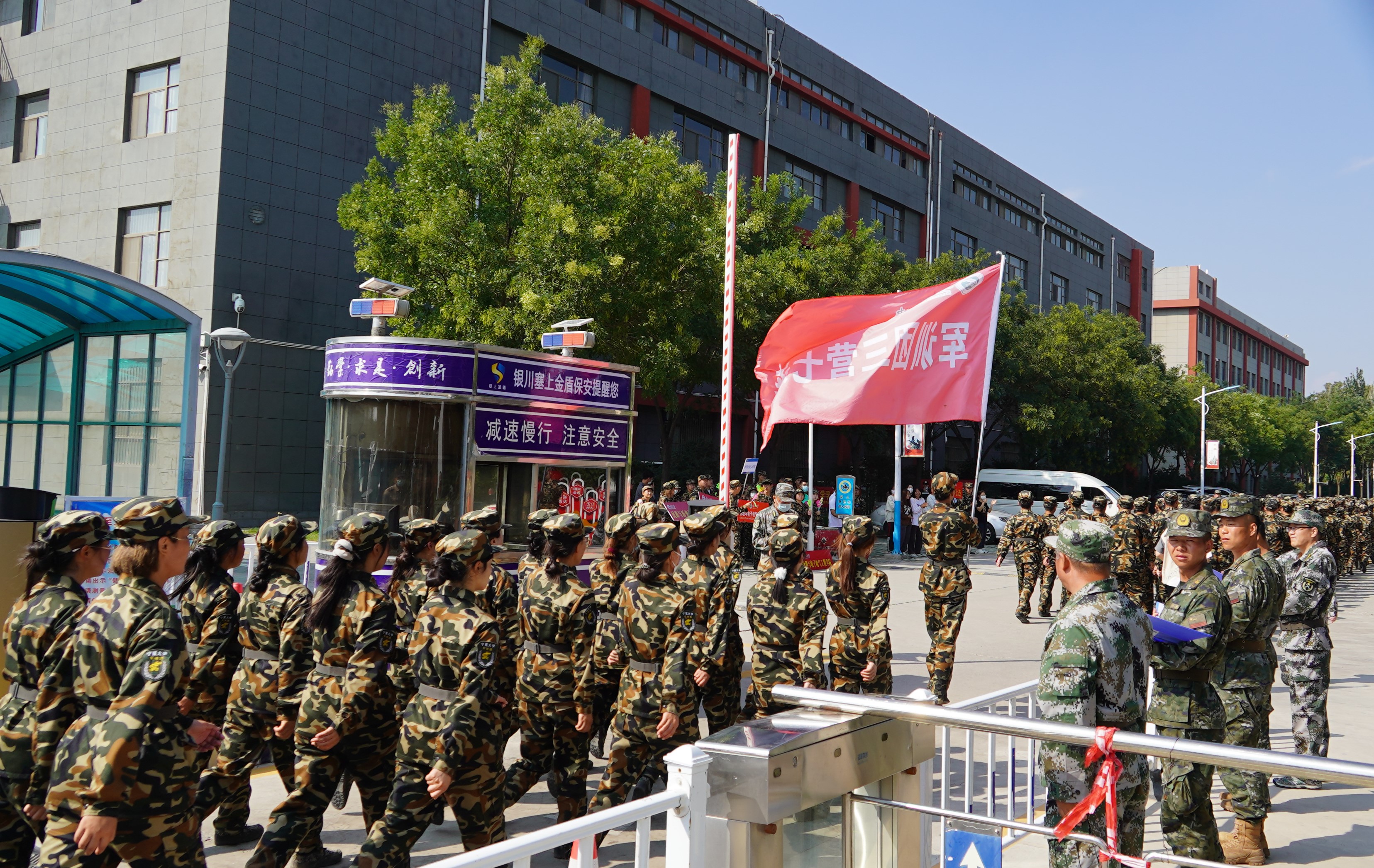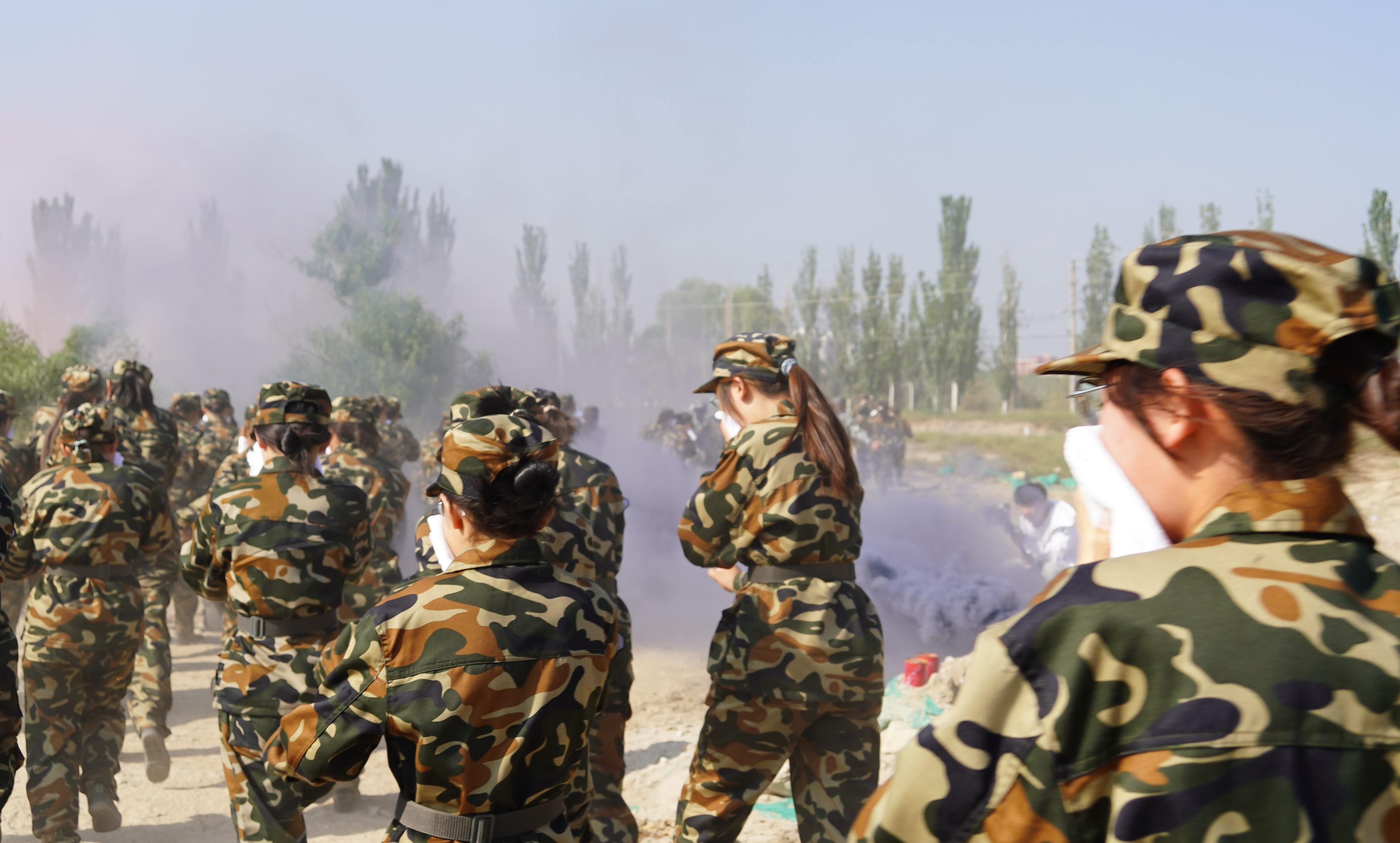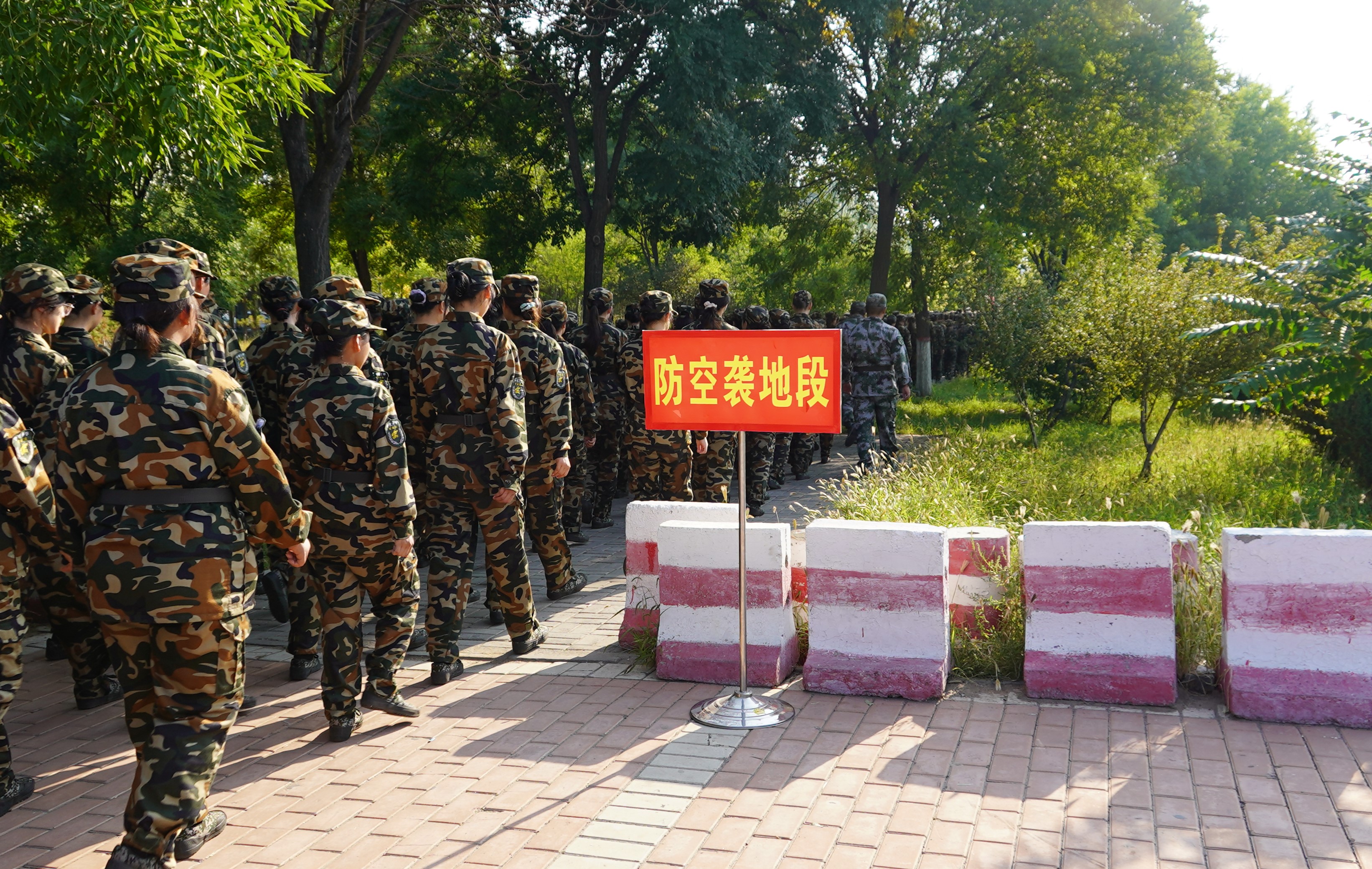 伴着朝阳,我们在教官和老师的带领下,精神抖擞地走出校门。这次的拉练任务是8.5公里的行进,并在途中进行防空演练、完成传口号任务与穿越防生化带。