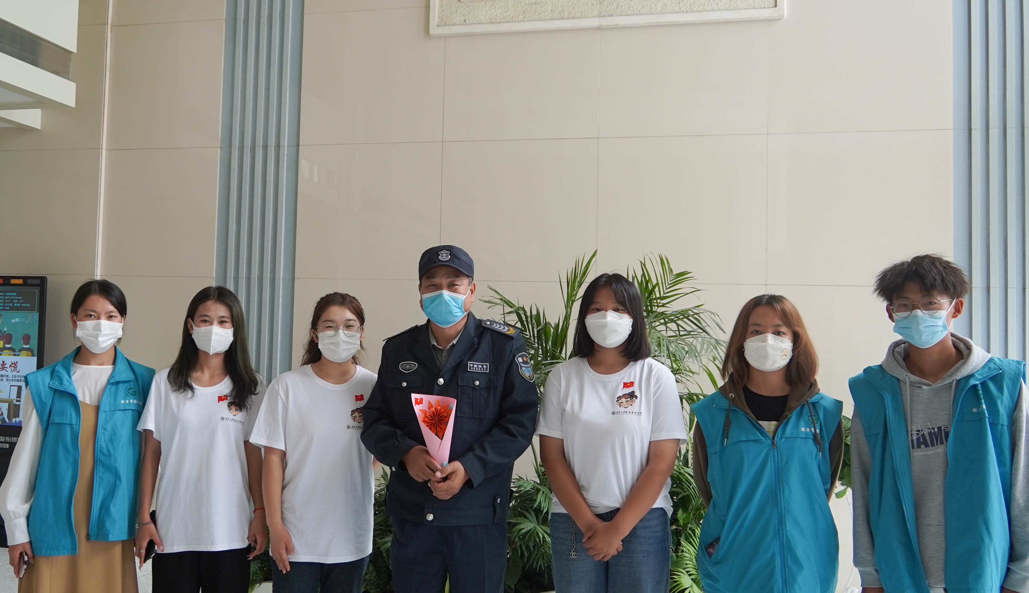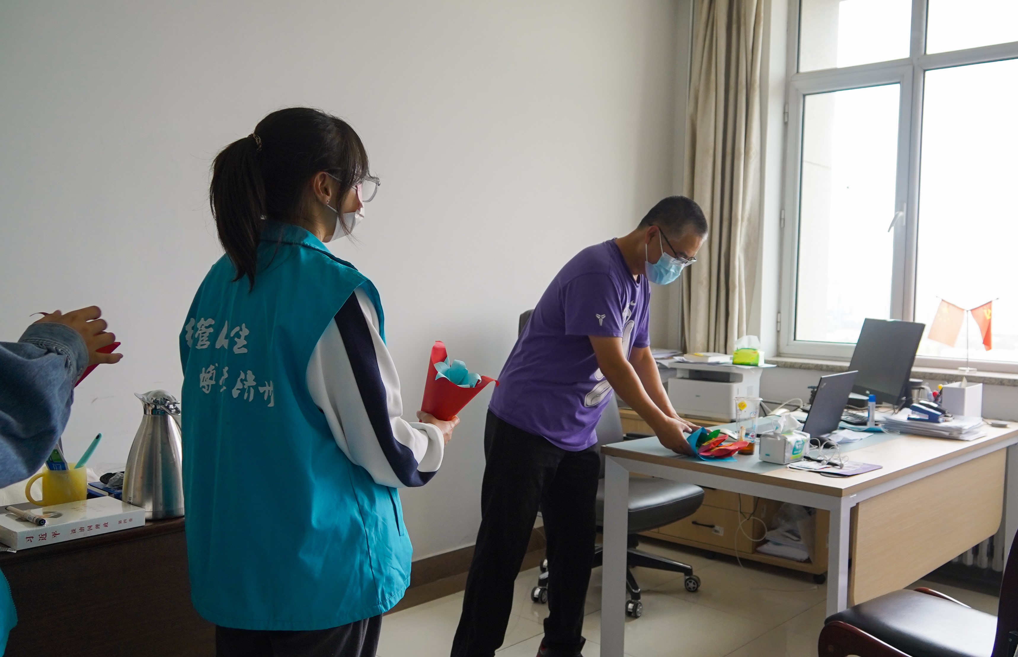 捧一抹暖阳,捻一抹纸香。同学们在静心布置的过程中享受折纸过程的快乐,在细心折叠与修剪中感受集体活动带来的喜悦。几个小时后,精心制作的小花束就在同学们的合作中完成了。活动最后,由代表同学将配有祝福语的花束分别送给了在办公室、公寓楼、餐厅工作的教职工和后勤人员。