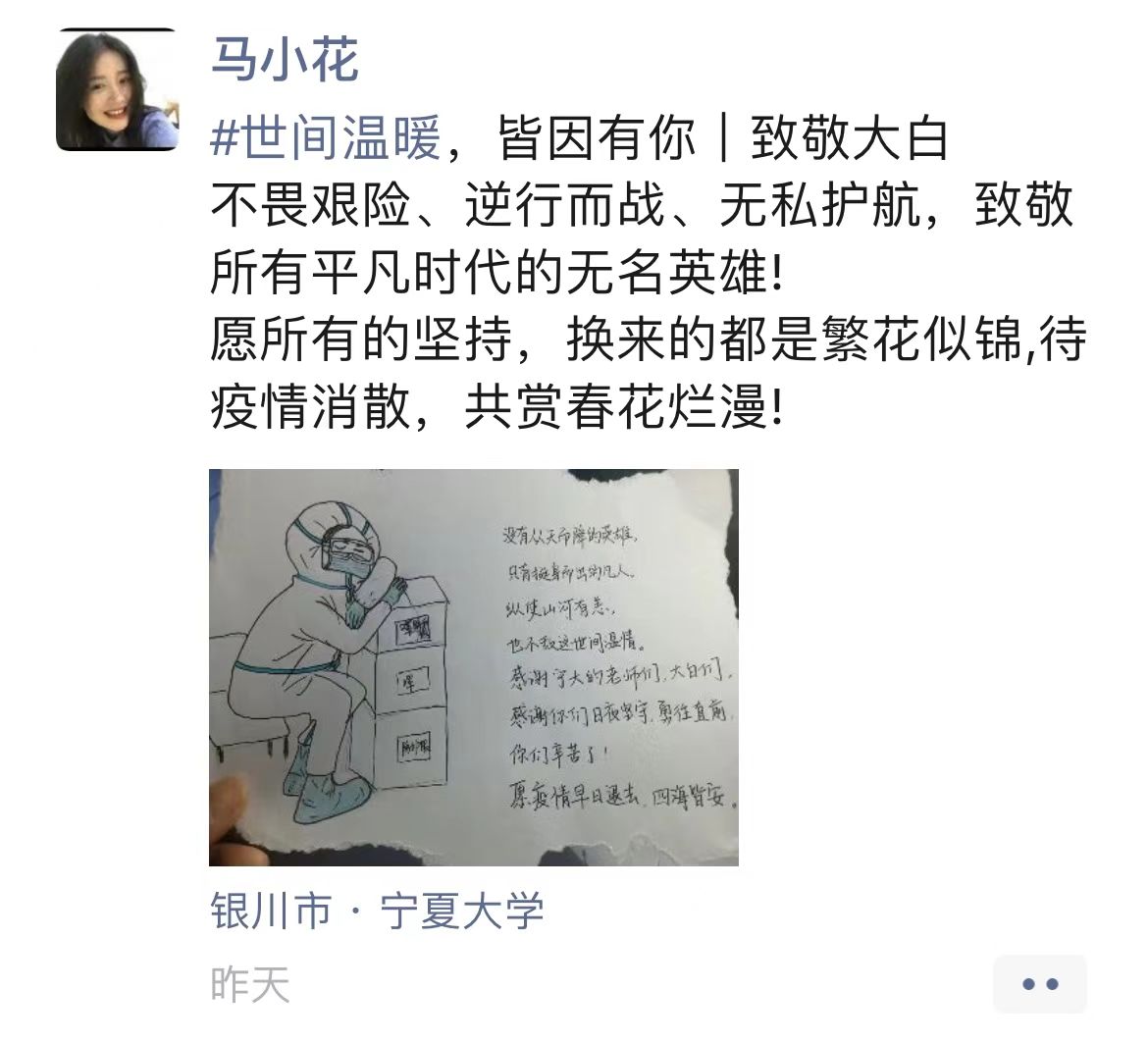 没有从天而降的英雄,只有挺身而出的凡人。志愿者老师身着防护服,宛如一个个“大白”扎根疫情一线,他们不分昼夜、坚守岗位、春风化雨、守护平安,他们以生命温暖生命,志在心中,愿在行动,用信念、责任、担当书写着一个又一个温暖瞬间。同学们沐浴雨露,心满阳光,积极配合核酸、抗原的采集工作,举办宿舍活动,制作卡片,手绘“大白”,表达内心的感激之情,他们不畏风雨、砥砺前行、逆向而行、向暖而生,努力传递更温暖的力量,用实际行动证明他们的成长,展现青春担当。