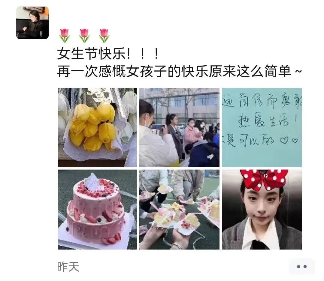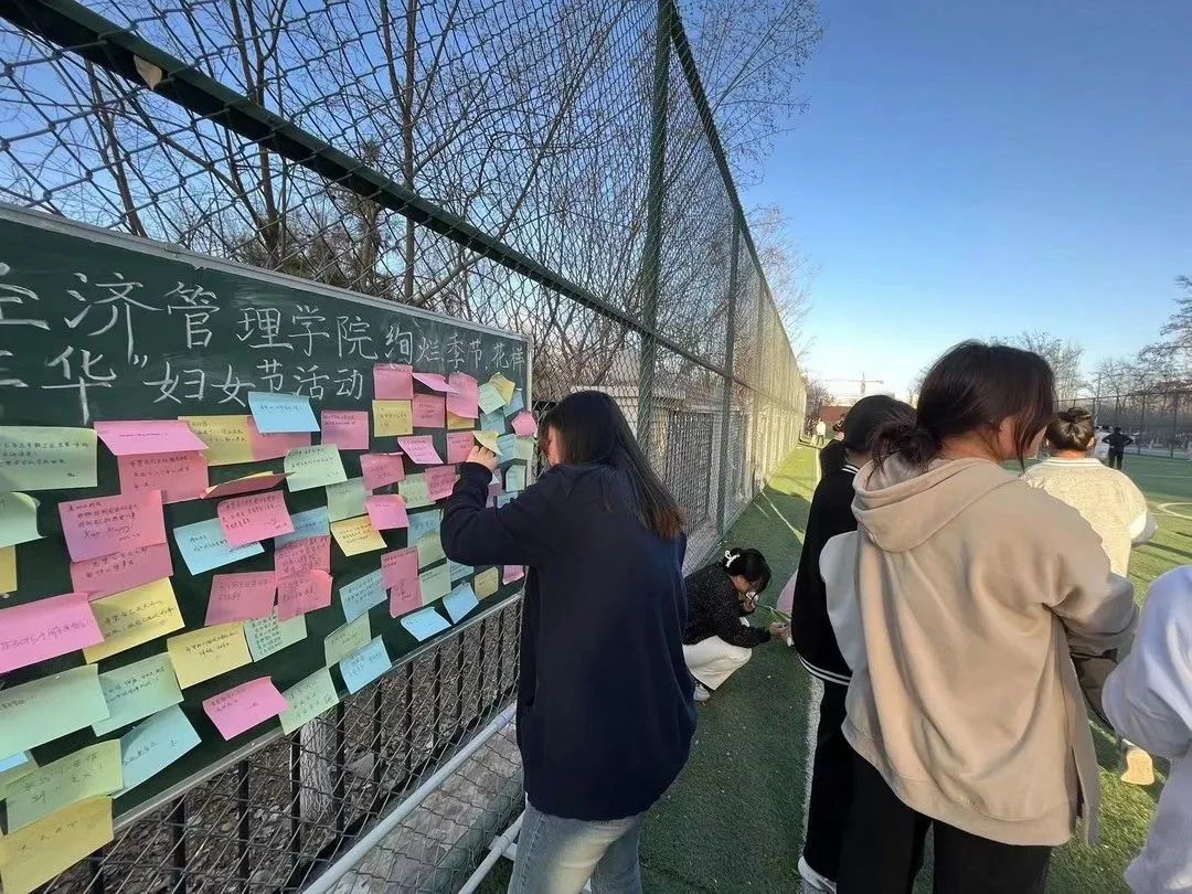 为了庆祝这个重要的日子,展现女生的风采。让女生的可爱、优雅、温柔、智慧、坚韧…如春天的花一样在这个万物复苏的时节绽放属于自己的光彩。在此次活动中,个个青春洋溢的笑脸与夕阳的余晖形成最美的光景。女生们纷纷写下自己最美好的心愿并且粘贴在小黑板上。做完这些还可以领到美丽的鲜花。在操场上,女生们有的唱着歌,有的捧着鲜花拍照,每个人的身影都显得那么美好。
