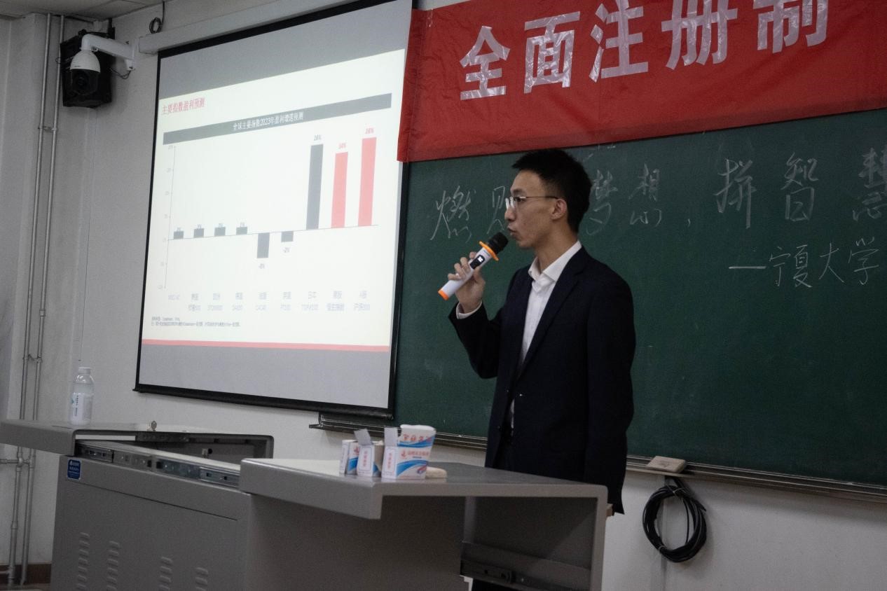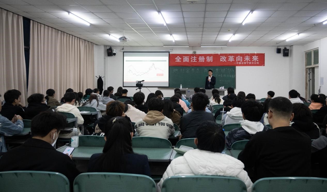 第一届“中泰杯”模拟炒股大赛知识培训讲座于贺兰山校区文荟楼113教室顺利举行。此次讲座由中泰证券宁夏分公司高级经理李楠主讲。