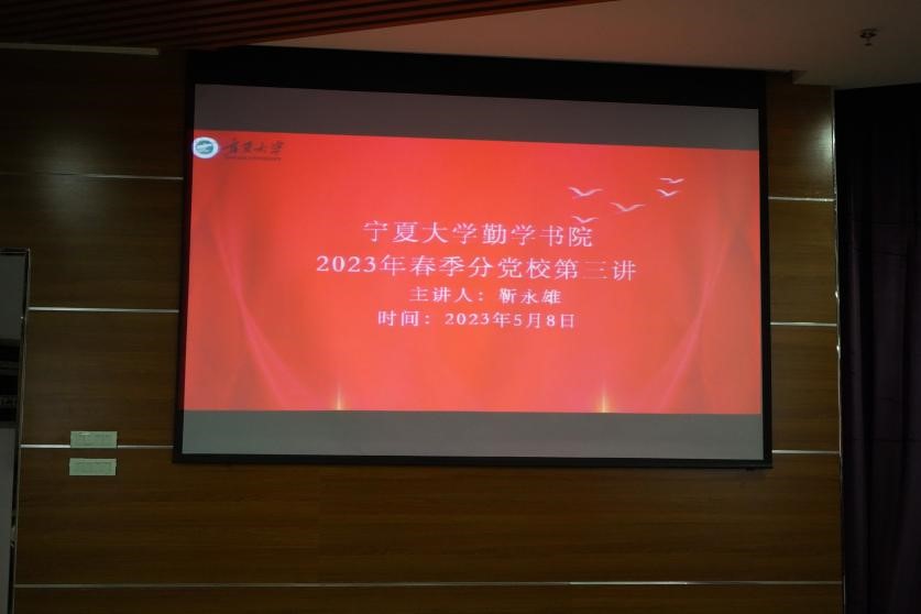 为加强新时代爱国主义教育,着力培养堪当民族复兴大任的时代新人,5月8日晚,勤学书院党委副书记靳永雄以《爱国主义与大学生成长成才》为题,在贺兰山校区文荟楼模拟法庭讲授学习贯彻习近平新时代中国特色社会主义思想主题教育专题党课。勤学书院第一期入党积极分子、发展对象参加学习。