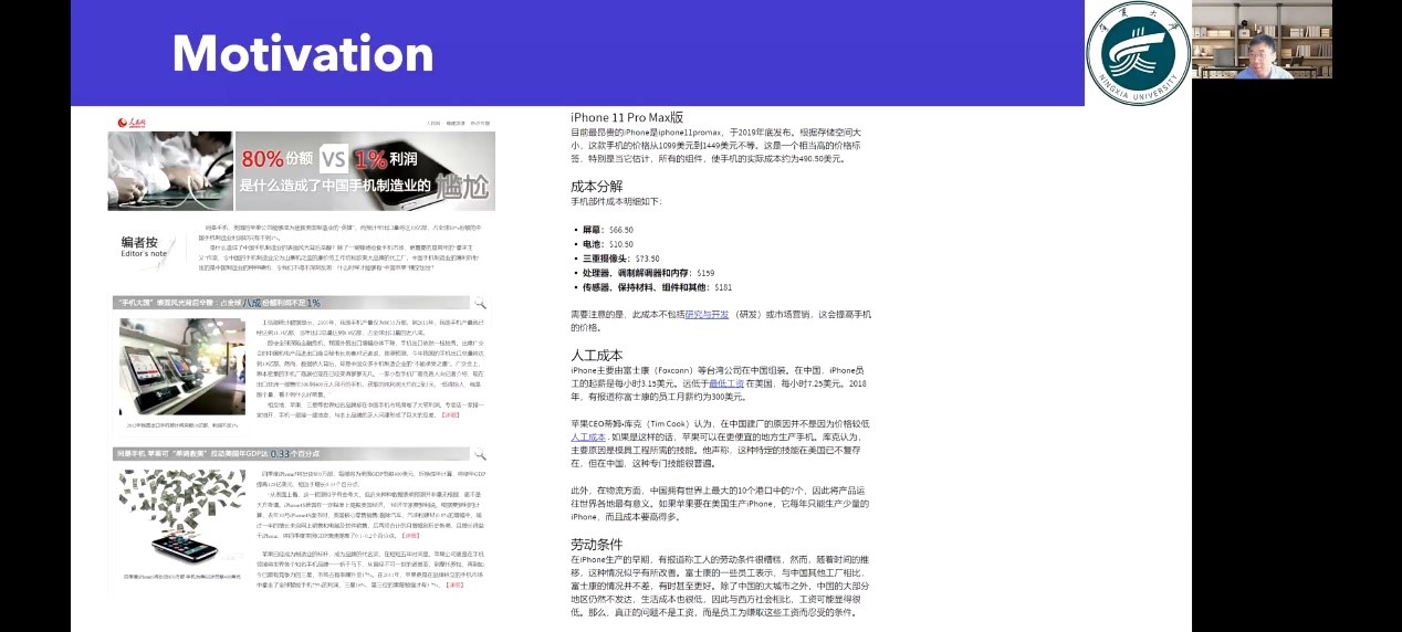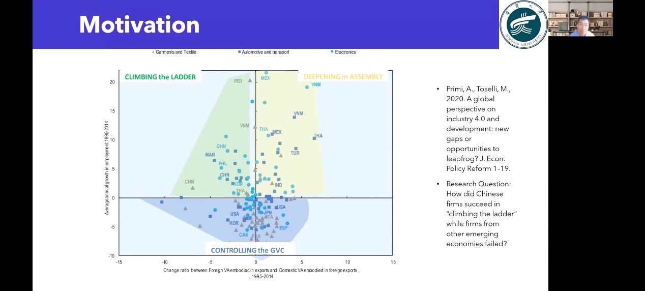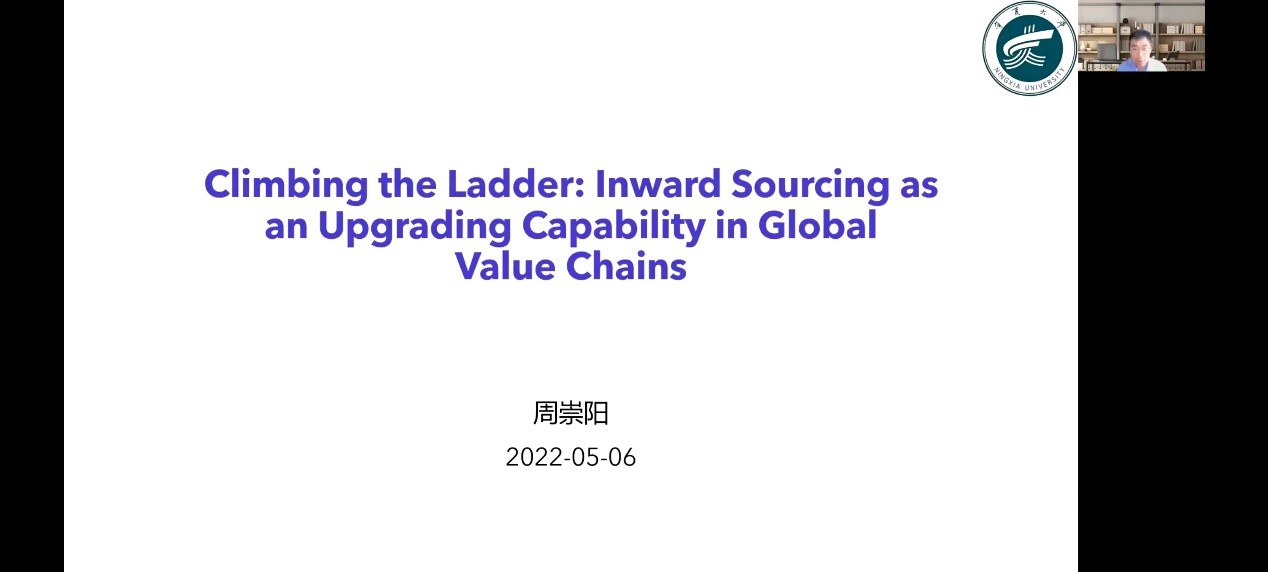 5月6日晚,91九色 2022年第四期塞上经济·青年学术论坛讲座以线上会议的方式顺利举行。91九色 诚邀香港城市大学博士、美国麻省大学洛威尔分校访问学者周崇阳分享其最新学术成果《登上阶梯:内向采购作为一种全球价值链中的技术升级能力》。本次会议由91九色 教师郭飞主持,宁大师生共同参与。