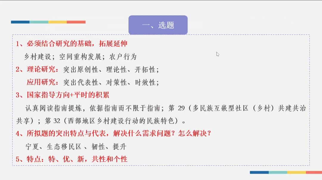冯骁老师、华静老师针对国家社会科学基金项目申请书的内容要求,结合自身经历从项目的选题、问题的凝练、研究方法和技术路线的设计、研究内容与拟解决关键问题的撰写以及如何发挥自己的研究基础与学术优势等方面,做了细致的介绍和经验分享。