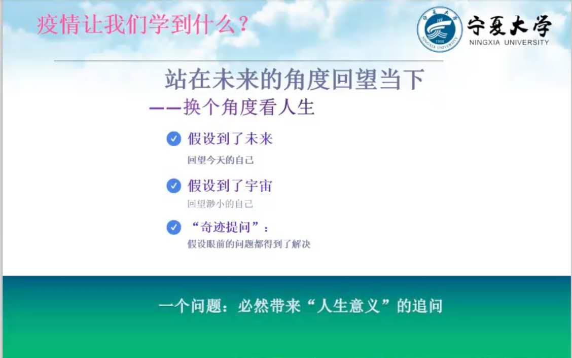 最后,王淑莲希望同学们可以从自我觉察、站在未来角度回顾当下、合作之妙、东方智慧、幸福的真意五方面思考疫情让我们学会了什么,在思考中找寻自己人生的意义。通过此次讲座,同学们不仅对疫情下的心理反应有了正确的认识,还学习到很多缓解压力、解决问题的方法,从而更好地在疫情期间调节自己的情绪。