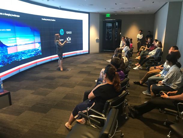 在慧与公司,慧与公司亚太地区商业发展负责人Amy女士围绕IT技术全球化应用的混合性趋势、智能技术在客户终端的应用、数据分析以及移动应用三个方面,对公司的历史沿革、主要业务构成及发展方向进行了介绍和讲解,并以慧与大学为例,阐述了该公司在提升数据、IT技术应用度及缓解大数据人才短缺方面所做的工作。在提问环节,黄译箴同学提出慧与大学是否有线上学习课程的问题,Amy称慧与公司正在完善建设慧与大学线上课程,争取通过线上传播大数据有关理论知识,但仍无法满足实践经验的获取。此外,李蕊同学代表市场营销专业背景同学,请Amy结合慧与公司发展介绍市场营销经验,Amy指出,市场营销应有全局思维,一方面通过整合资源,有效连接产品端供给和客户端需求,另一方面,纵观全局开展营销,也能够发现并弥补公司短板,促进公司发展完善。