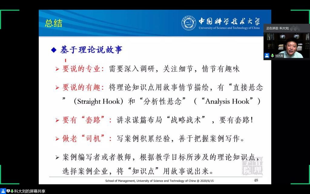刘教授围绕“工商管理案例的选题与撰写”这一主题,根据多年案例采编经验和教学心得,从教学案例类别与研究、案例需求识别与知识梳理、案例使用说明初稿的撰写等视角逐一进行了精彩讲解。