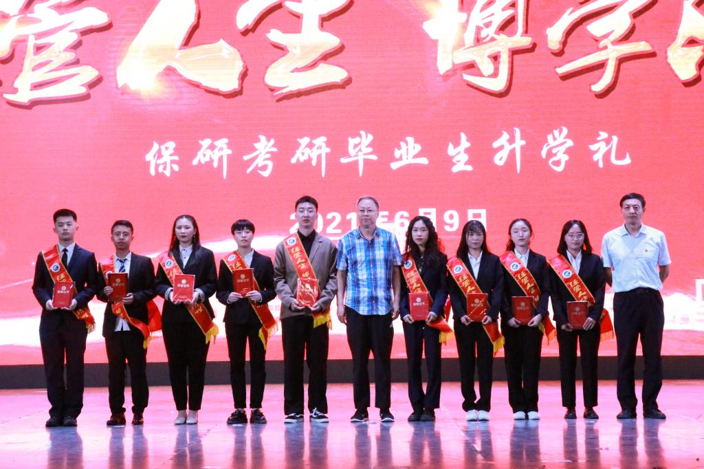 鹏北海,凤朝阳,又携书剑路迢迢。在保研考研毕业生升学礼上,马建宏宣读了2021届升学学生名单后,马军、付森为2021届升学学生代表刘朔宇、田虎、倪雪、刘彦麟、张宽元、马雯婧、马灵琴、翟玥、马兴梅佩戴绶带。在校友联络员履职礼上,张逸宣读了2021届校友联络员学生名单,朱伟、杨国涛为2021届本科毕业生代表罗龙,研究生代表孙玥赠送纪念品。