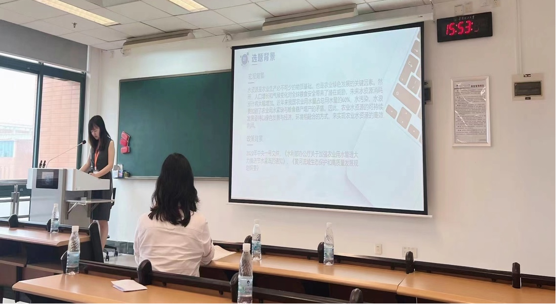 硕士研究生罗静怡汇报了论文《中国谷物生产用水绿色效率与回弹效应研究——基于三阶段SBM-Malmquist指数》。论文基于中国31个省(市、自治区)2010-2020年面板数据,以谷物生产水足迹作为投入指标,谷物生产灰水足迹作为非期望产出,对中国谷物生产用水绿色效率进行了评价,在此基础上,测算了技术进步条件下谷物生产用水的回弹效应。研究发现,应当加强农业水资源管理,深挖用水效率提升潜力,优化谷物生产要素投入结构,推动节水技术推广与应用,从而减轻水环境污染,实现农业绿色可持续发展。