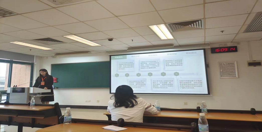 硕士研究生赵心怡汇报了论文《绿色金融赋能共同富裕的影响机制与空间效应分析》,论文以绿色金融的提出为背景展开,随着绿色产业的发展以及传统产业的绿色改造,由此产生的绿色金融需求逐渐增多,而实现共同富裕离不开金融服务,绿色金融为赋能共同富裕提供了强有力的支撑。汇报结束后,场下的学者与宣讲者就论文的亮点和存在的问题展开了深入讨论。东梅教授也给出了一些修改建议。