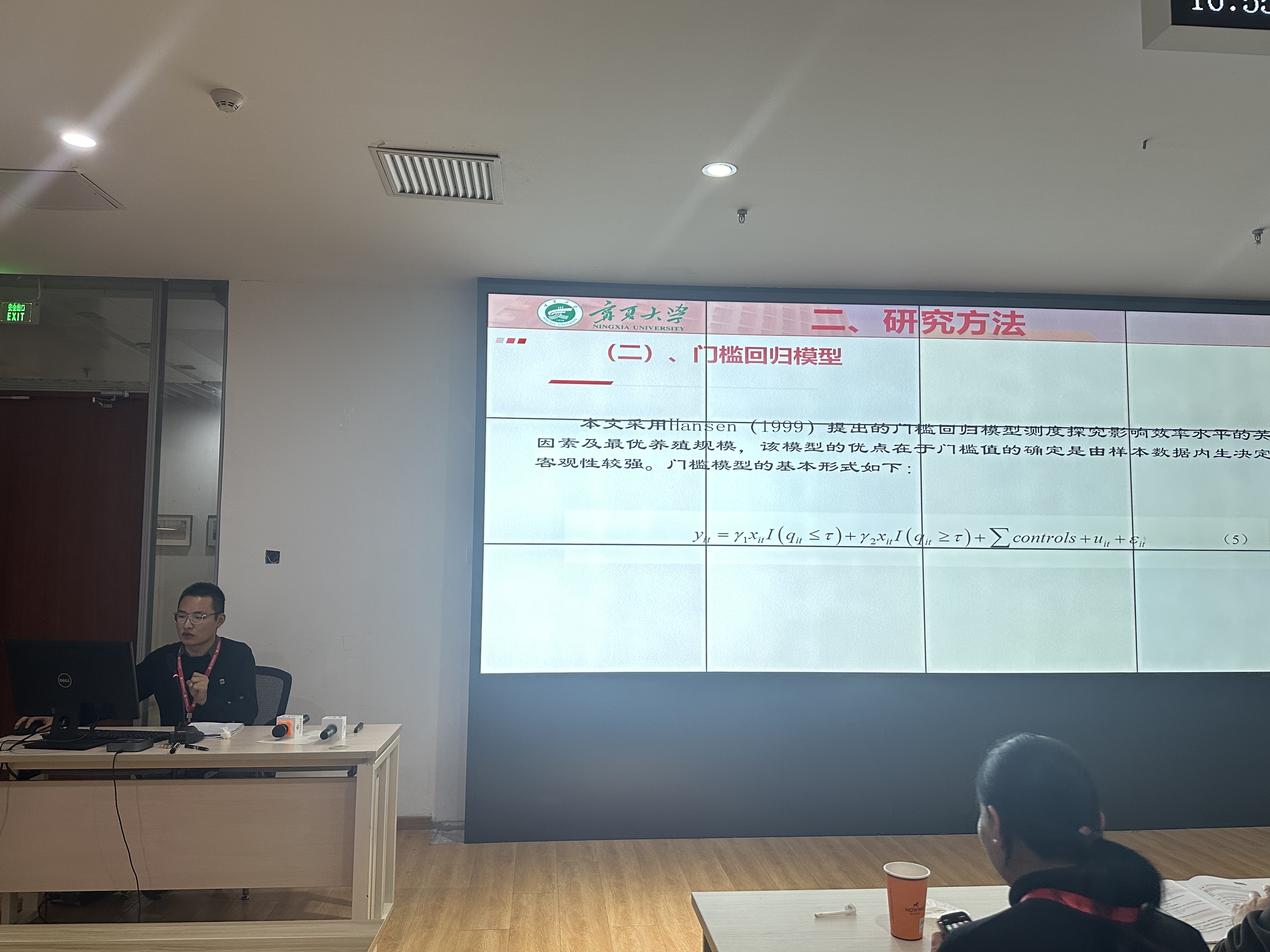 研究生刘晓斌报告论文题为《黄河流域养殖户绿色生产效率与最优养殖规模测度——基于C-D生产函数和门槛回归的实证分析》。论文以黄河流域肉羊养殖户为研究对象,基于宁夏、陕西、甘肃3省(区)1194户养殖户实地调查数据,对养殖户绿色生产效率进行测算,并使用门槛回归模型,探究影响效率水平的关键因素及能够实现最高效率水平的最优养殖规模。研究结论如下:一是养殖户技术效率水平较高,不同地区间差异较小;配置效率和成本效率水平较低,且不同地区间存在显著差异。二是养殖规模对配置效率和成本效率水平均具有促进作用,且存在双重门槛值。三是养殖规模的扩大通过提高养殖户规范化养殖认知水平和采纳疫病传播预防行为可能性来促进其效率水平的提高。