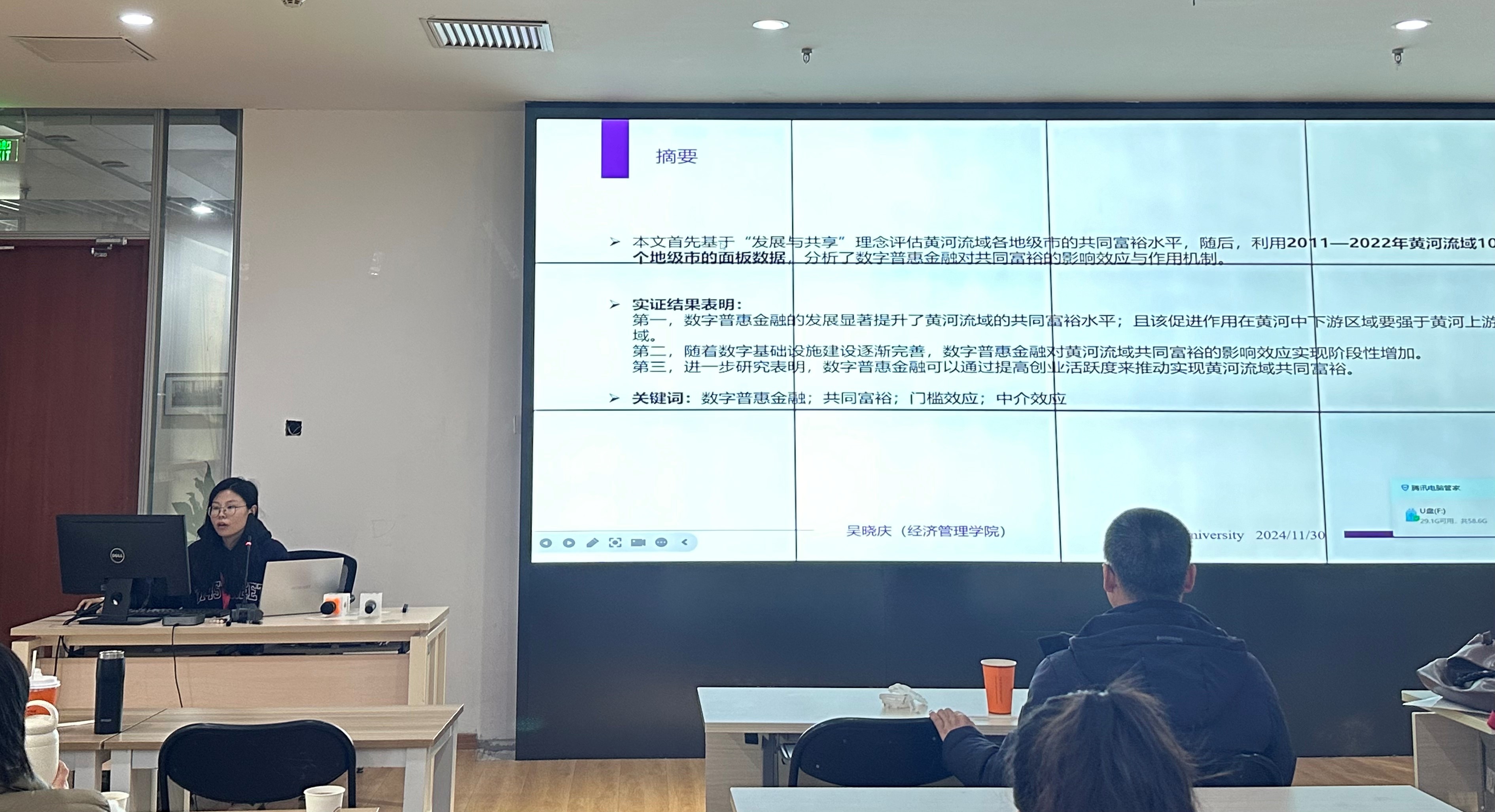 研究生吴晓庆报告论文题为《数字普惠金融对共同富裕的影响效应与作用机制——基于黄河流域的实证》。论文基于“发展与共享”理念评估黄河流域地级市的共同富裕水平,随后利用2011—2022年黄河流域100个地级市的面板数据分析数字普惠金融对共同富裕的影响及其机制。研究发现:数字普惠金融的发展显著提升了黄河流域整体和上中下游流域的共同富裕水平;具体到子维度,其覆盖广度、使用深度及数字化水平均能有效促进共同富裕。