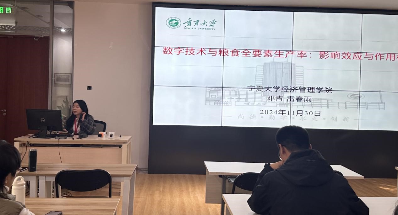 研究生邓青报告论文题为《数字技术与粮食全要素生产率:影响效应与作用机制》。论文基于2012-2022年的30个省份的面板数据,构建数字技术与粮食全要素生产率指标体系,采用固定效应模型、系统GMM模型和中介效应模型深入剖析了数字技术对粮食全要素生产率的影响效应及作用机制,其实证研究结果表明:一是数字技术发展水平提高能显著提升粮食全要素生产率,且作用效果存在区域差异性,具体表现为粮食主销区>粮食主产区>产销平衡区;二是数字技术的应用能够提高农业劳动生产率,从而提升粮食全要素生产率;三是产业结构高级化会加强数字技术对粮食全要素生产率的提升作用;四是数字技术通过实现水粮有效转化成为提高粮食全要素生产率。