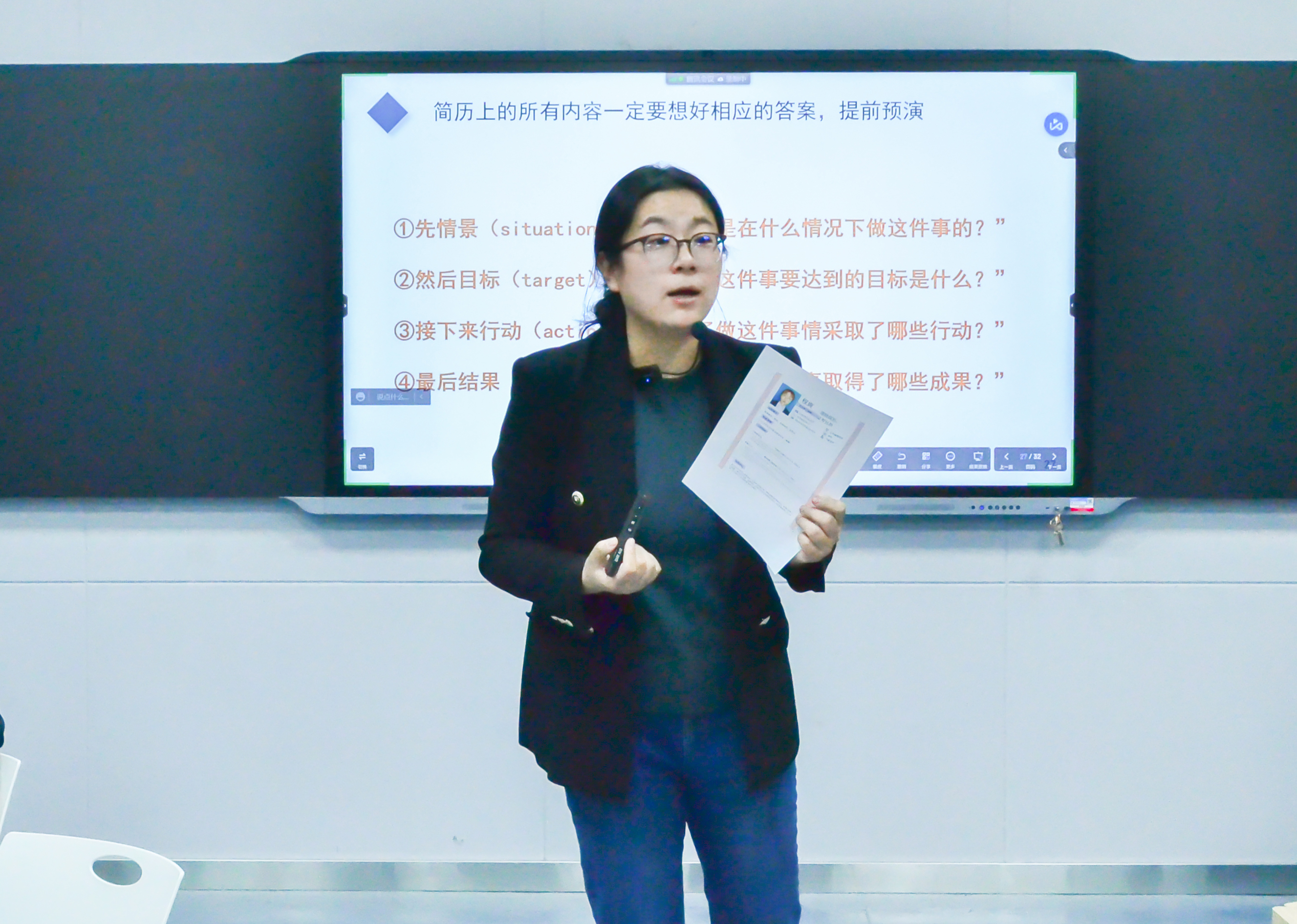 刘淑萍强调,在面试之前,同学们应该首先了解面试人的需求,包括知识、素质和技能等方面。她讲解了“望闻问切”的面试技巧,并提到了如何进行面试的前期准备工作和面试中的具体做法,介绍了锻炼表达能力、逻辑能力的方法。刘淑萍表示简历要具有真实性,突出重点、详略得当,并对简历上所涉及的内容进行了预设并做出了回答。