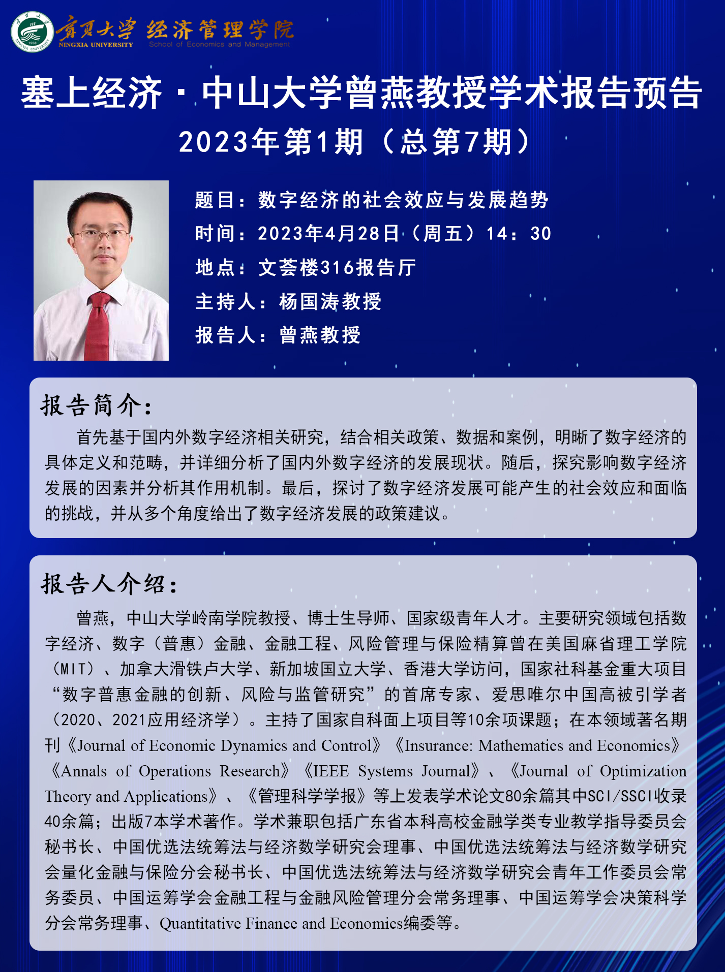 曾燕,中山大学岭南学院教授、博士生导师、国家级青年人才、。主要研究领域包括数字经济、数字(普惠)金融、金融工程、风险管理与保险精算曾在美国麻省理工学院(MIT)、加拿大滑铁卢大学、新加坡国立大学、香港大学访问,国家社科基金重大项目“数字普惠金融的创新、风险与监管研究”的首席专家、爱思唯尔中国高被引学者(2020、2021应用经济学)。主持了国家自科面上项目等10余项课题;在本领域著名期刊《Journal of Economic Dynamics and Control》《Insurance: Mathematics and Economics》《Annals of Operations Research》《IEEE Systems Journal》、《Journal of Optimization Theory and Applications》、《管理科学学报》等上发表学术论文80余篇其中SCI/SSCI收录40余篇;出版7本学术著作。学术兼职包括广东省本科高校金融学类专业教学指导委员会秘书长、中国优选法统筹法与经济数学研究会理事、中国优选法统筹法与经济数学研究会量化金融与保险分会秘书长、中国优选法统筹法与经济数学研究会青年工作委员会常务委员、中国运筹学会金融工程与金融风险管理分会常务理事、中国运筹学会决策科学分会常务理事、Quantitative Finance and Economics编委等。