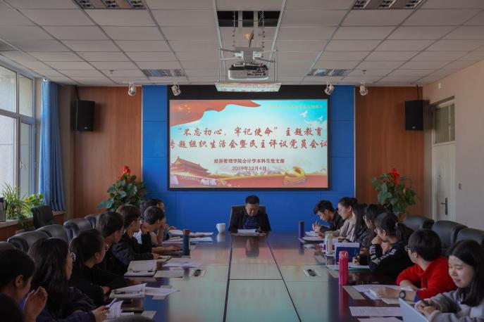 会计学本科生党支部于贺兰山校区文荟楼904会议室召开了“不忘初心,牢记使命”主题教育专题组织生活会与民主评议党员会议。院党委书记张桓以及陈兵、马晓春、王淑欣等34名支部党员参加会议。会议由支部党员罗妍主持。