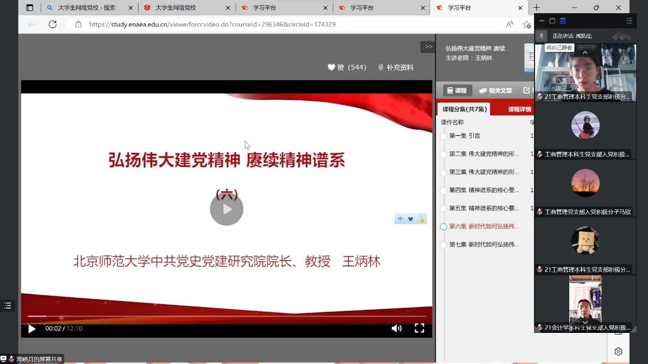 本期视频带领同学们深刻领会了伟大建党精神的历史地位和时代价值,详细讲述了新时代如何弘扬伟大建党精神,要求同学们应在学思践悟中坚定理想信念,坚持马克思主义在意识形态领域的指导地位,坚持党的领导。视频为同学们详细介绍了党章的基本框架和主要内容,重点对党章的总纲部分、党员、党的组织制度、党的纪律、党和共产主义青年团的关系等内容进行了讲解,使同学们明白了学习党章的重要性。