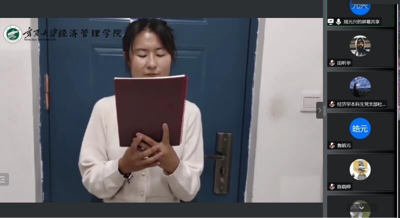 10月13日晚,“抓党建促团结进步·铸牢中华民族共同体意识”党日活动在线上顺利举行。经济学本科生党支部书记马静及经济学本科生党支部全体党员参会,会议由周元兴主持。