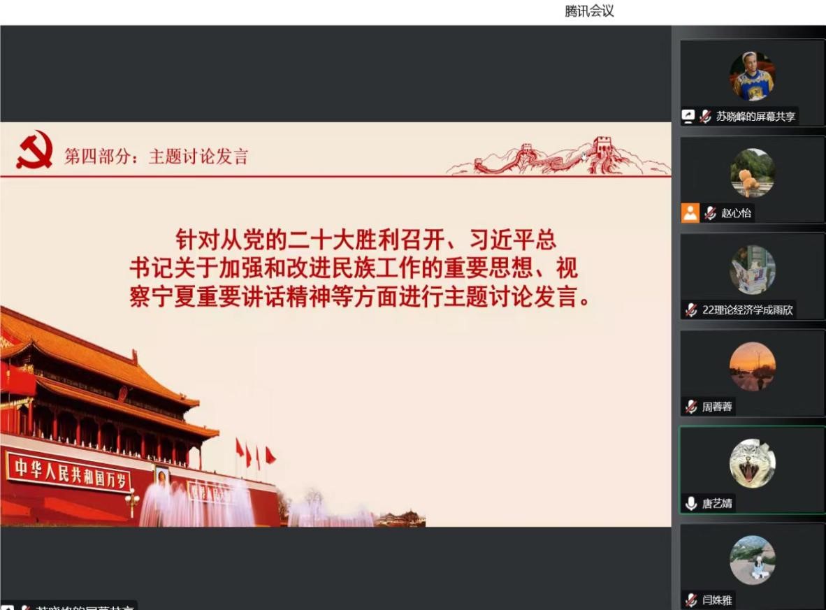 学术型研究生党支部“铸牢中华民族共同体意识”主题党日活动在线上顺利召开。党支部全体党员、发展对象及积极分子参加会议,会议由党支部副书记苏晓峰主持。
