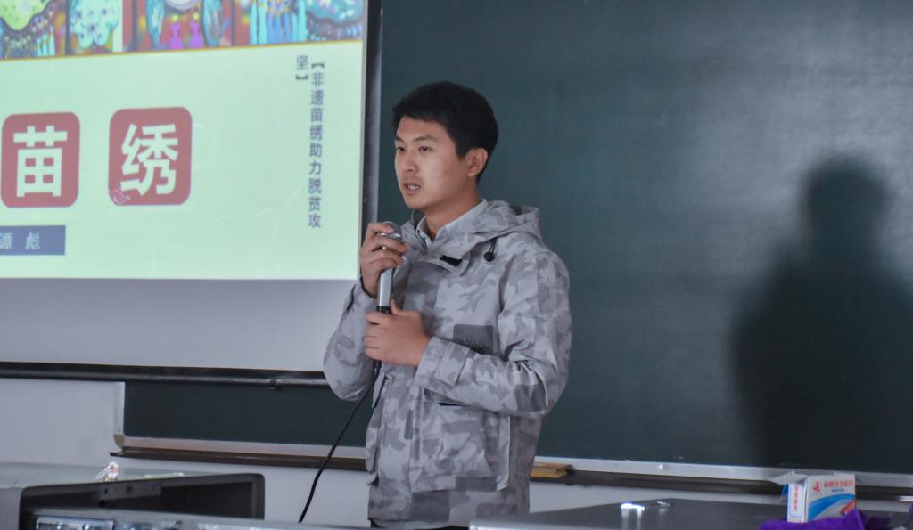 谭彪向全体学员分享了第一次去新疆下乡的经历,并通过视频的方式为大家展示了下乡活动的具体流程,激发了学员们的浓厚兴趣。通过分享PPT,他从课题描述、实践过程、特色活动、实践成果四个步骤向学员们介绍了他另一个下乡课题《彭水苗绣》。他通过大量的照片展示,丰富了学员们对于三下乡实践活动的见识,使学员们对三下乡实践活动充满憧憬。