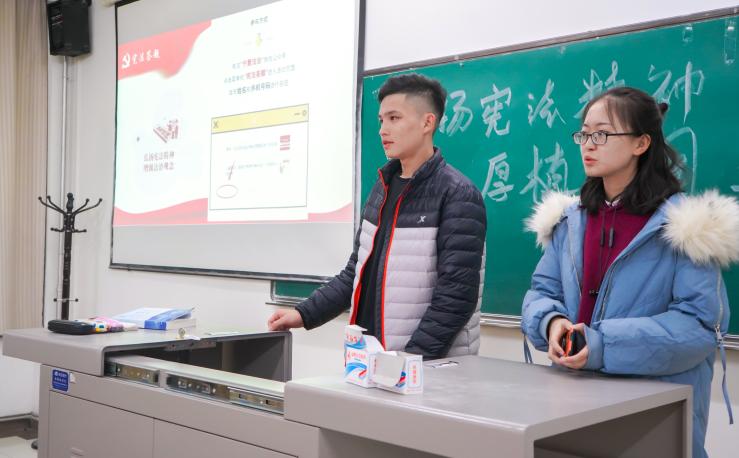 活动初,各班团支书组织同学欣赏短片《宪法》,该片讲述了宪法的地位及意义,指明了作为新时代的青年学子应当如何弘扬宪法精神。在观看完短片后,同学们各抒己见,展开了激烈的讨论,通过思维的碰撞与认知的交流,对宪法有了更为深刻的认识。在随后的宪法知识竞答环节中,通过回答一道道竞赛题,法与国的概念在同学们心中越发明晰起来。而后,团支书对本次活动进行了总结,并鼓励同学们在日后的学习生活中更加积极主动学法守法护法。在《宪法伴我成长》庄严的歌声中,本次团日活动圆满结束。