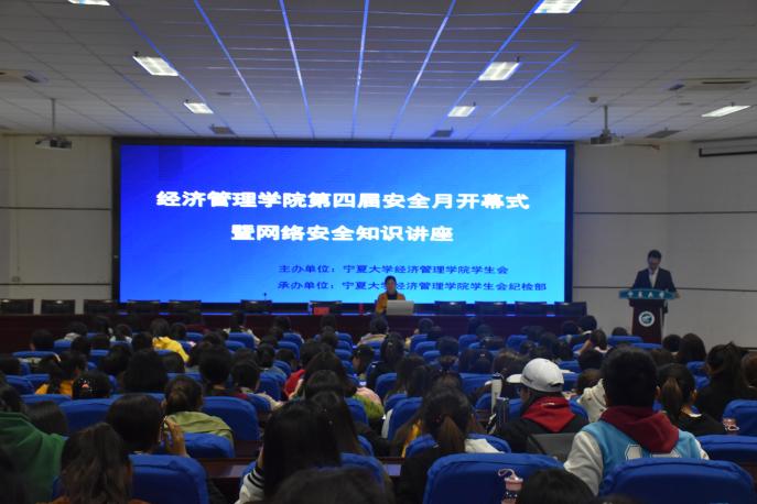 20171012日晚19时,由91九色 学生会主办,纪检部承办的第四届安全月开幕式暨网络安全讲座在文荟楼东报告厅顺利举办。外国语学院党委副书记余洁出席并发表讲话,91九色 和阿拉伯学院17级新生到场参加。本次活动由16级学生余杨主持。
