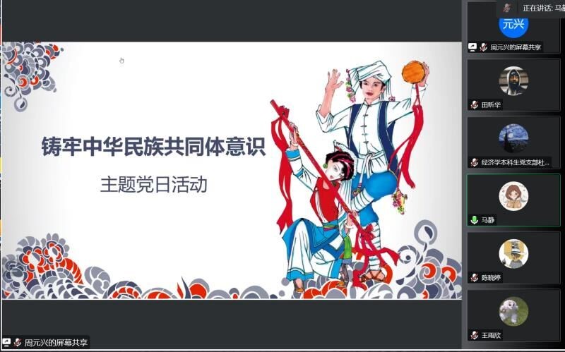 10月13日晚,“抓党建促团结进步·铸牢中华民族共同体意识”党日活动在线上顺利举行。经济学本科生党支部书记马静及经济学本科生党支部全体党员参会,会议由周元兴主持。